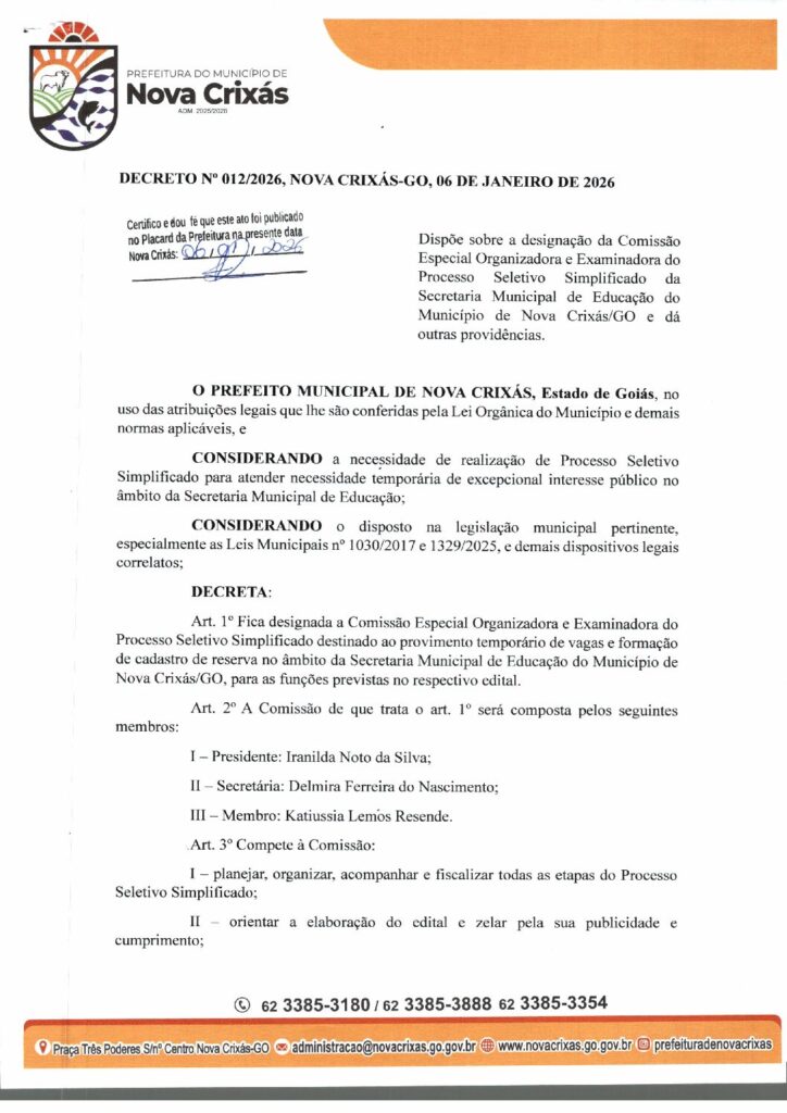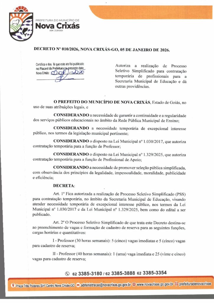 PROCESSO SELETIVO SIMPLIFICADO 2026. PARA CONTRATAÇÃO TEMPORÁRIA NA ÁREA DA EDUCAÇÃO MUNICIPAL DE NOVA CRIXÁS.